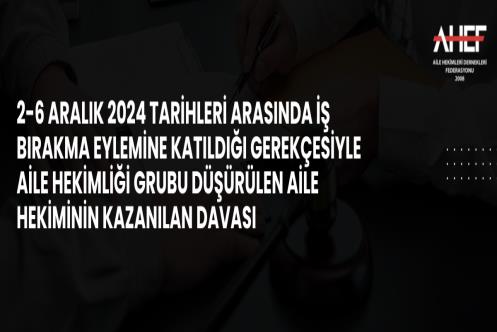 2-6 ARALIK 2024 TARİHLERİ ARASINDA İŞ BIRAKMA EYLEMİNE KATILDIĞI GEREKÇESİYLE AİLE HEKİMLİĞİ GRUBU DÜŞÜRÜLEN AİLE HEKİMİNİN KAZANILAN DAVASI Detaylar VEFAT HABERİ Detaylar Aile Hekimliği Zirvesi Eylül 2025 Detaylar AHEF, Hukuka Aykırı Yönetmeliğe Karşı Danıştay’da Dava Açtı Detaylar Aile Hekimliği Zirvesi Detaylar AİLE HEKİMLİĞİ SÖZLEŞME VE ÖDEME YÖNETMELİĞİ DEĞİŞİKLİĞİ HAKKINDA DUYURU Detaylar AHEF 9. Olağan Genel Kurulu Hakkında Duyuru Detaylar Evlilik Raporlarına Dair Başvuru Dilekçesi Web Sitemizde Detaylar Danıştay İkinci Dairesi Tarafından Yürütmesi Durdurulan Hükümler Hakkında Bilgilendirme Detaylar SAHU EĞİTİM SÜRESİNİN DÜŞÜRÜLMESİNE YÖNELİK TALEP DİLEKÇESİ Detaylar