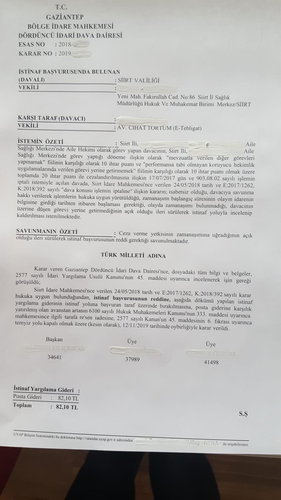 "Performansa tabi olmayan koruyucu hekimlik uygulamalarında verilen görevi yerine getirmemek" fiili karşılığı olarak 10 ihtar puanı ve "mevzuatla verilen diğer görevleri yapmamak" fiili karşılığı olarak 10 ihtar puanı olmak üzere 20 ihtar puanı verilen cezaya itiraz için Siirt idare mahkemesinde açılan davada, İdarenin verdiği ceza puanı iptal edilmiştir.