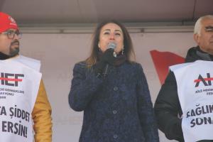 Özlem Sezen konuşmasında hak kayıplarına da değinerek; son 9 yılda aile hekimlerinin ve aile sağlığı çalışanlarının gelirleri %40 oranında eridi, mevcut ekonomik koşullar altında zaten büyük mücadele verirken bir yandan da sağlık çalışanlarına şiddet terörü inanılmaz boyutlara geldi dedi.