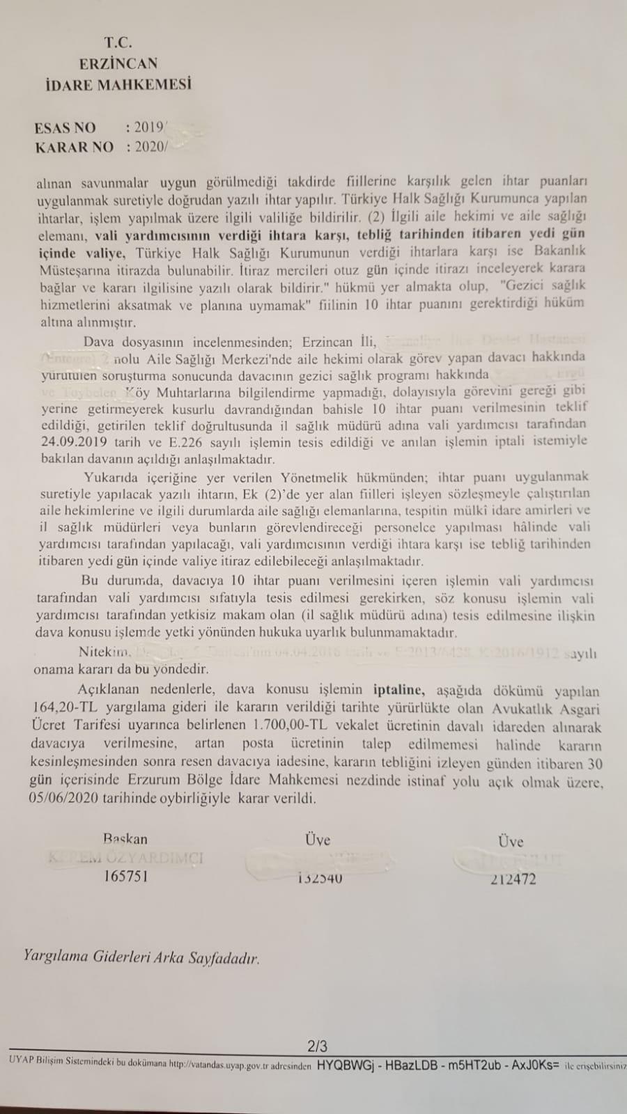 Erzincan ilinde görevli hekimimiz hakkında uygulanan ihtar yaptırımının iptali maksadıyla AHEF tarafından verilen hukuki destekle açılan davada Mahkemece; "aile hekimi olan davacıya 10 ihtar puanı cezası verilmesini içeren işlemin vali yardımcısı tarafından vali yardımcısı sıfatıyla tesis edilmediği" gerekçesi ile işlemin iptaline karar verilmiştir. Dava konusu ihtar yaptırımı, vali yardımcısı tarafından ve fakat il sağlık müdürü adına imzalanmıştı. Tüm hekimlerimize saygı ile duyururuz.