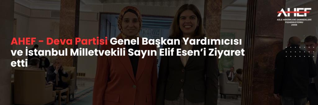 Aile Hekimleri Dernekleri Federasyonu Yönetim Kurulu Başkanı Dr. Türkü Yağmur Nehir, bugün Türkiye Büyük Millet Meclisi’nde Çocuk Hareketi kurucularından Deva Partisi Genel Başkan Yardımıcısı ve İstanbul Milletvekili Sayın Elif Esen’i ziyaret etti. Görüşmede, çocuk sağlığı ve refahı için aile hekimlerinin birinci basamak sağlık hizmetlerindeki kritik rolü üzerine istişarelerde bulunuldu.